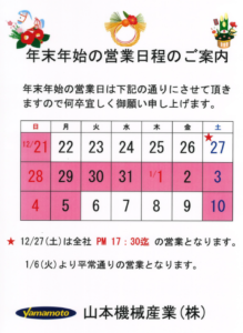 本年もお世話になりました。 年末年始営業日のご案内です。 尚12/27は第4土曜日ですが年末特別営業をいたします。 17:30閉店となっておりますのでお気を付けください。